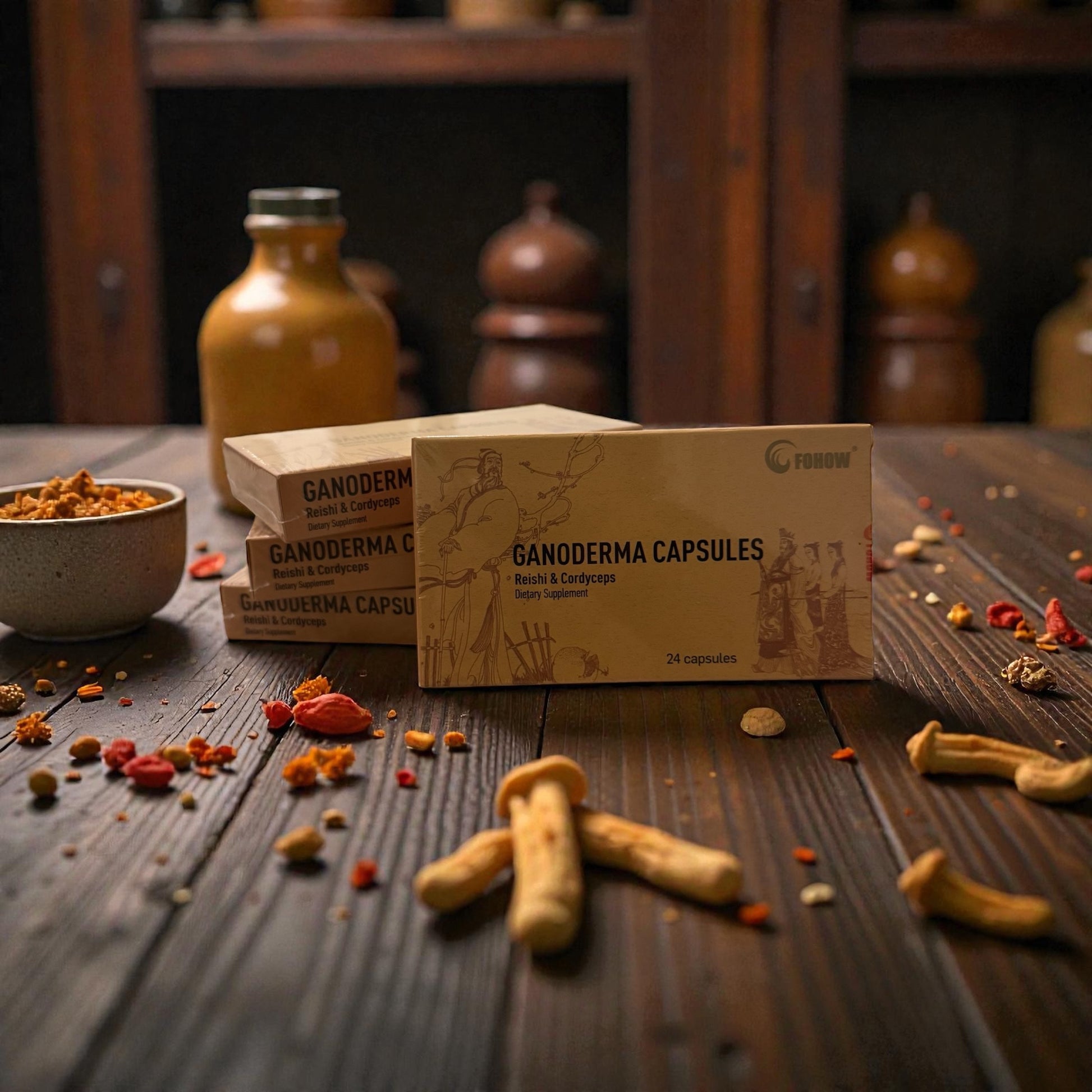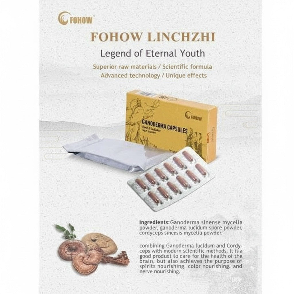Linchzhi Capsules are formulated using Chinese Ganoderma (Ganoderma lucidum), revered as the "Plant of Eternal Youth." Advanced cell membrane splitting technology is utilized to maximize the bioavailability of active compounds, including polysaccharides, amino acids, vitamins, and minerals.